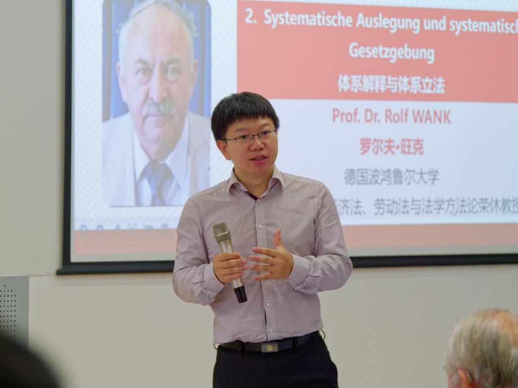 旺克教授以《体系解释与体系立法》为题进行报告。他指出,法律思维使得法律人有时会忽视法律间的关联,于是,为了打开整体的视野,法律人需要体系解释这一解释规准。在方法论层面,体系解释可以进一步区分为外部体系术和内部体系术,就外部体系术而言,旺克教授的举例是法学生学习时对一个条文全部款项的阅读和整体把握,内部体系术则需要根据生活事态来确认相关规则之间的关联。随后,旺克教授讲到体系解释背后的体系立法存在的困难,他以德国劳动法立法中的“雇员概念”等为例印证。最后,他提出,萨维尼的方法论并不认可目的论解释,而是主张一种实质体系术,这要求法律人在解释法律时审查单个法律或一系列法律是否以及在多大程度上建立在连贯的体系术之上。