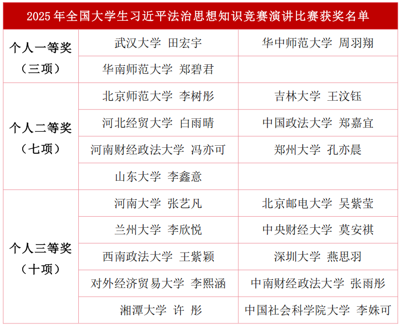 至此,2025年全国大学生习近平法治思想知识竞赛圆满落幕。法治兴则国兴,法治强则国强。习近平法治思想从历史和现实相贯通、国际和国内相关联、理论和实际相结合上深刻回答了新时代为什么实行全面依法治国、怎样实行全面依法治国等一系列重大问题,是全面依法治国、建设法治中国的根本遵循,也是法学教育和法学研究的科学指南。本次竞赛通过对习近平法治思想的知识要义与精神内核的考察,以赛促学、以赛促思。未来,我们将继续携手共进,以知识竞赛为平台,汇聚各方智慧和力量,共同推动习近平法治思想深入人心,为实现中国式法治现代化贡献青年智慧、展现青春担当。