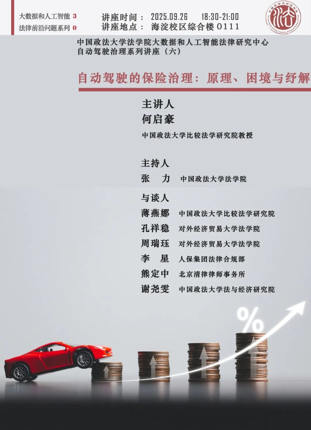 中国政法大学比较法学研究院教授何启豪老师为师生带来了一场题为“自动驾驶的保险治理:原理、困境与纾解”的精彩讲座,这也是法学院自动驾驶治理系列讲座的第六期。中国政法大学比较法学研究院教授薄燕娜老师、对外经济贸易大学法学院副教授孔祥稳老师、对外经济贸易大学法学院助理教授周瑞珏老师、人保集团法律合规部合规管理处经理李星老师、北京清律律师事务所首席合伙人熊定中老师、中国政法大学法与经济研究院副教授谢尧雯老师、百度公司刘维老师作为与谈嘉宾,与现场数十位师生共同参加了本次讲座。中国政法大学法学院副院长、教授张力老师担任本次讲座的主持人。